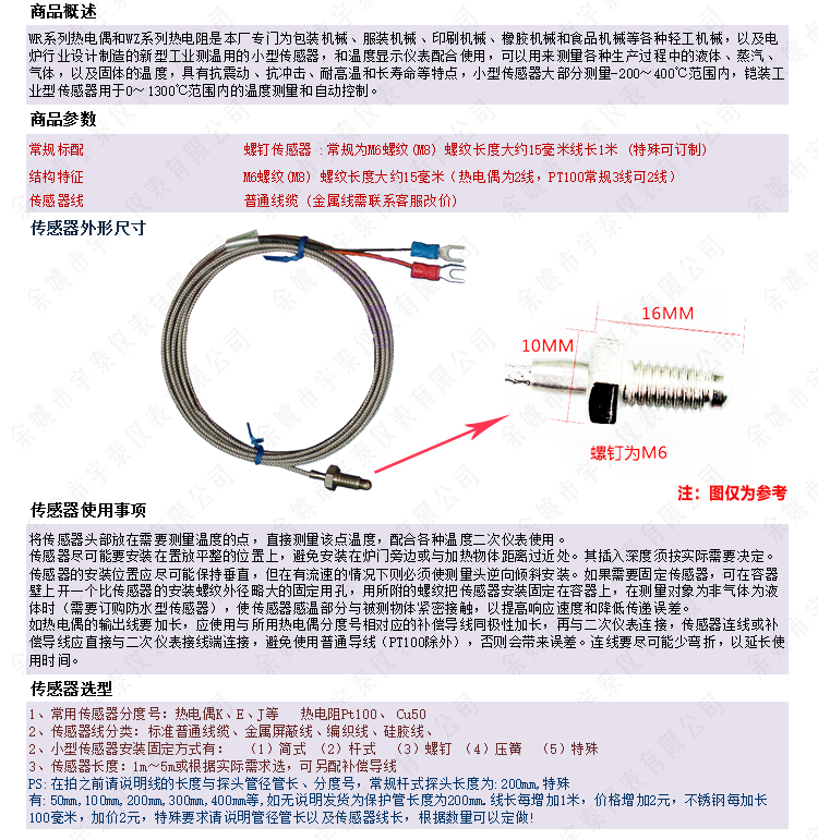 螺钉传感器应用塑料,食品机械,包装,橡胶等行业用于各种通过螺纹固定测温的各种机械强度高,耐压性能好的场所比较广泛,在屏蔽外层涂有耐高温材料,提高外层绝缘性,抗感应电,提高安全系数,螺钉温度传感器产品特点:体积小,M6螺纹固定,结构简单,无毛刺,引线输出(标配1米),灵敏性高。